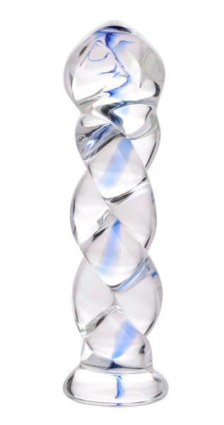 Embrace ecstasy with this erotically twisted dildo! The Soma Twisted Dildo has a twisted shaft that enlarges toward the top for amplified stimulation and features a modestly curved tip for tempting the G-spot. Soma is beautiful on the inside as well, with a subtle indigo wisp inside its center. Made from the finest polished glass, Soma is stunningly luxurious and designed to penetrate. Turn up the heat as your body temperature warms the glass, or use warmer water for even more intensity. Cool it down with a little ice as well, the sturdy borosilicate glass is durable, easily sterilized, non-allergenic, non-porous, and compatible with all lubes. Includes a complimentary storage satchel. Measurements 5.75 inches in length, 1.5 inches in diameter. Material Borosilicate glass. Color Clear and blue.