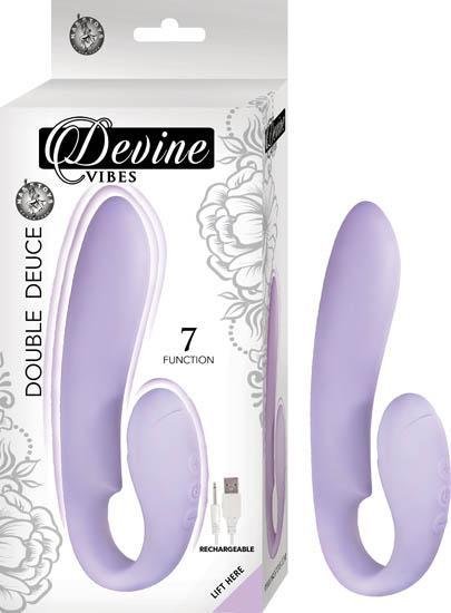 Devine Vibes Double Deuce Lavender Purple Vibrator from Nasstoys of New York. Vibrator features 7 function. Dual motors. Waterproof vibrations. Phthalates free RoHS compliant body safe silicone. Materials Silicone shafts, ABS plastic. Size length 6.5 inches. Rechargeable vibrations. USB Rechargeable charging time 60 minutes. Working play time 120 minutes.