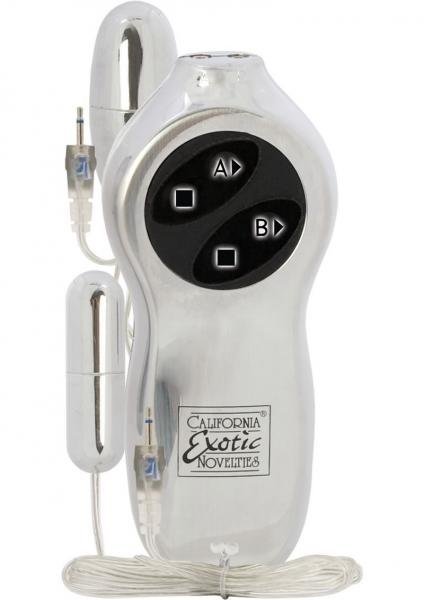 Powerful 7 function controller with 2 jacks. Independent controls. Controller 5 inches by 2 inches. Standard silver bullet 2.25 inches by 1 inch. Slimline silver bullet 2 inches by .5 inch. ABS plastic controller, ABS plastic with silver plating bullets. Vibrating bullets require 4 AA batteries, not included.