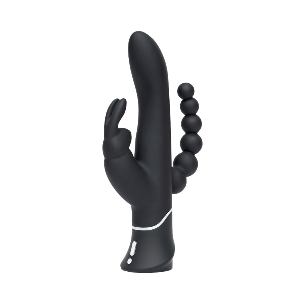 Happy Rabbit Triple Curve Rechargeable Rabbit style vibrator in Black. Peak pleasure with 3 deliriously powerful motors, 9 intense functions in the ears and beads, and 12 powerful speeds and patterns in the shaft. Crafted from velvety soft silicone, this USB rechargeable rabbit vibrator has been designed to target all of the hot spots. Not only a bedroom buddy, the rabbit's waterproof silicone body means it is shower friendly and open to a dip in the tub at any time.
