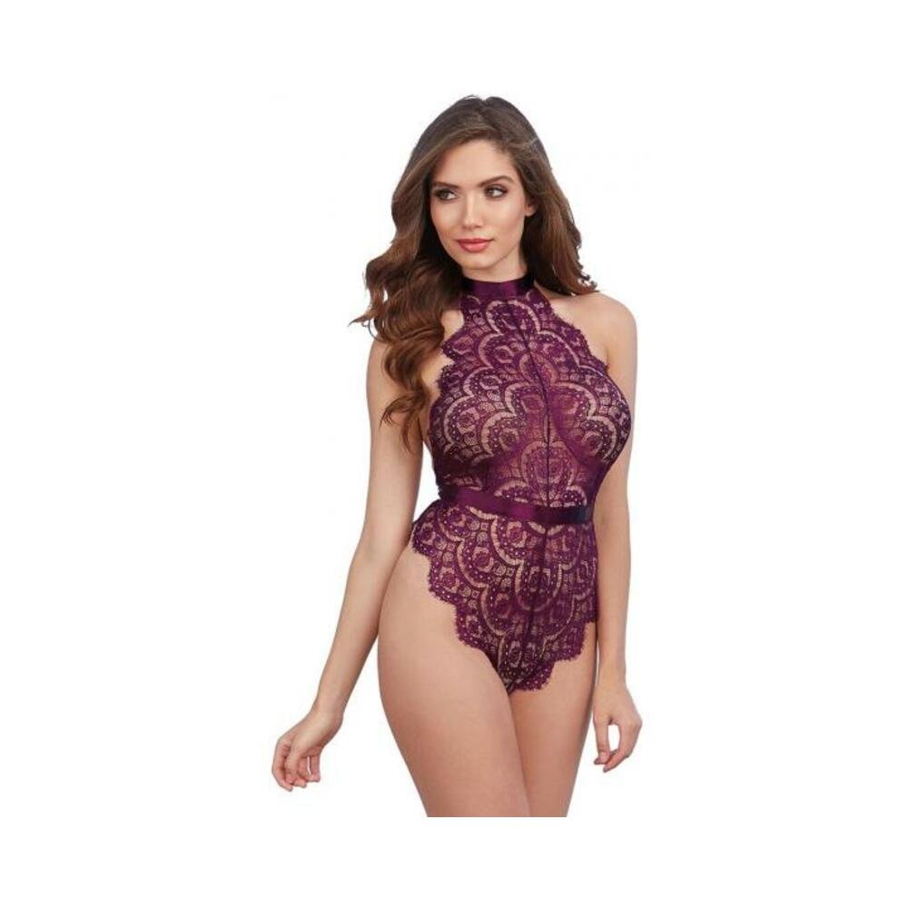 Dreamgirl Eyelash Lace Teddy With Halter Neckline And Low, Open Back With Adjustable Tie-back Ribbon