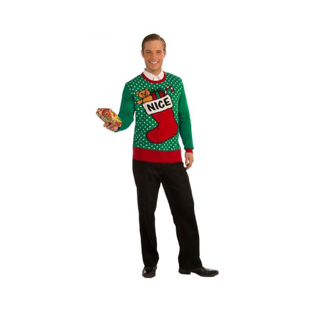 XL Christmas sweater adorned with a present filled stocking. Labels the wearer as Nice. Men size extra large, XL. Color Green.