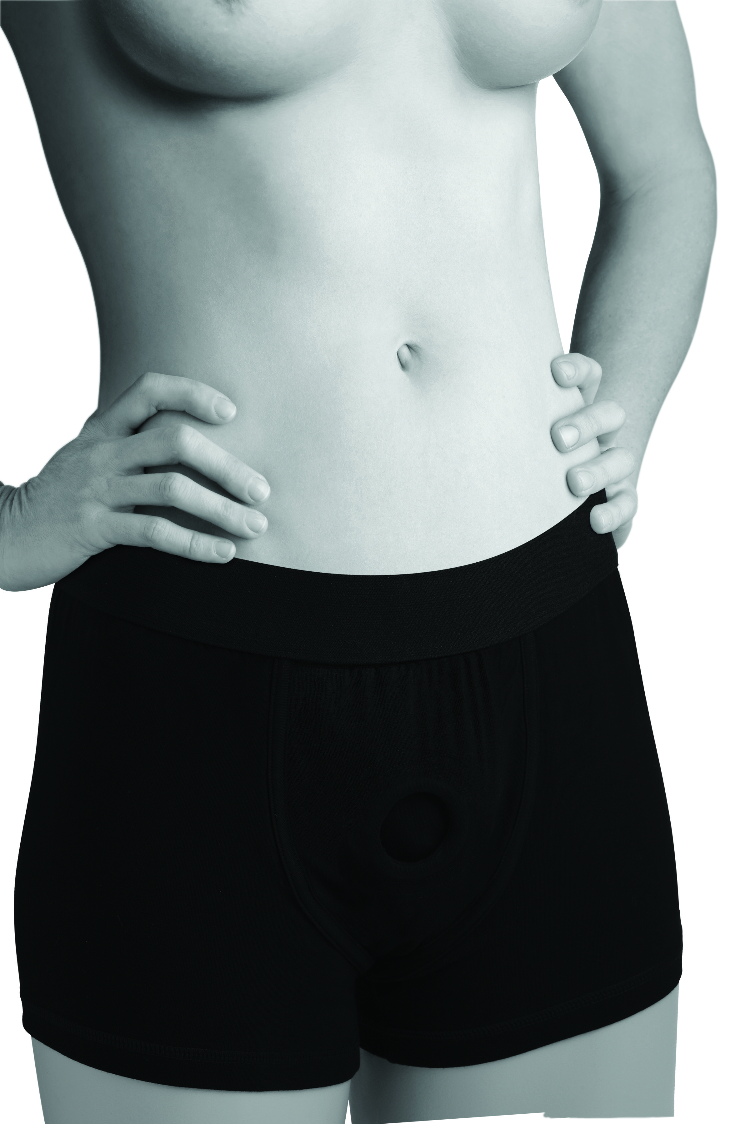 Feel more comfortable and stylish than ever before when you strap on your favorite dildo. This boxer brief style harness feels just like underwear, with an O-ring that stretches to accommodate most dildo sizes. You can even wear these cotton shorts out under your clothing, or stuff them with your favorite packer. This harness is excellent for extended wear. The supportive elastic waistband will carry the weight of your dong and you will be allowed greater mobility and position versatility. This harness is recommended for use with dildos that have a flat base that is 1.75 inches or wider.