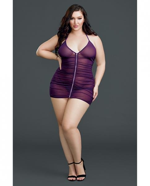 Ruched Sheer Front Zipper Chemise with G-String Panty from Dreamgirl International Red Diamond lingerie line. Color Plum Purple. Ladies plus sizes, one size queen. Sizes 16 to 20. Cups D/DD. Bust 40 inches to 54 inches. Waist 36 inches to 44 inches. Hips 42 inches to 56 inches. Weight 165 pounds to 275 pounds.